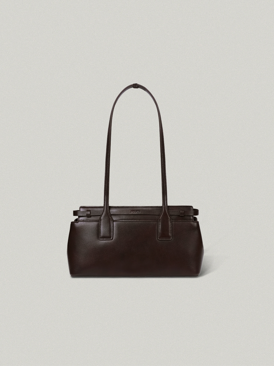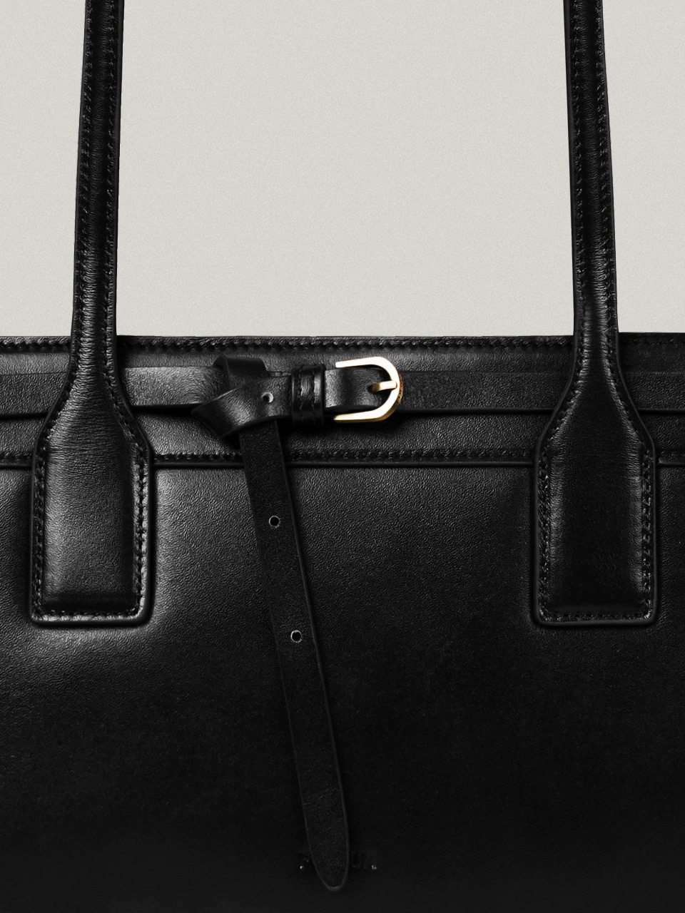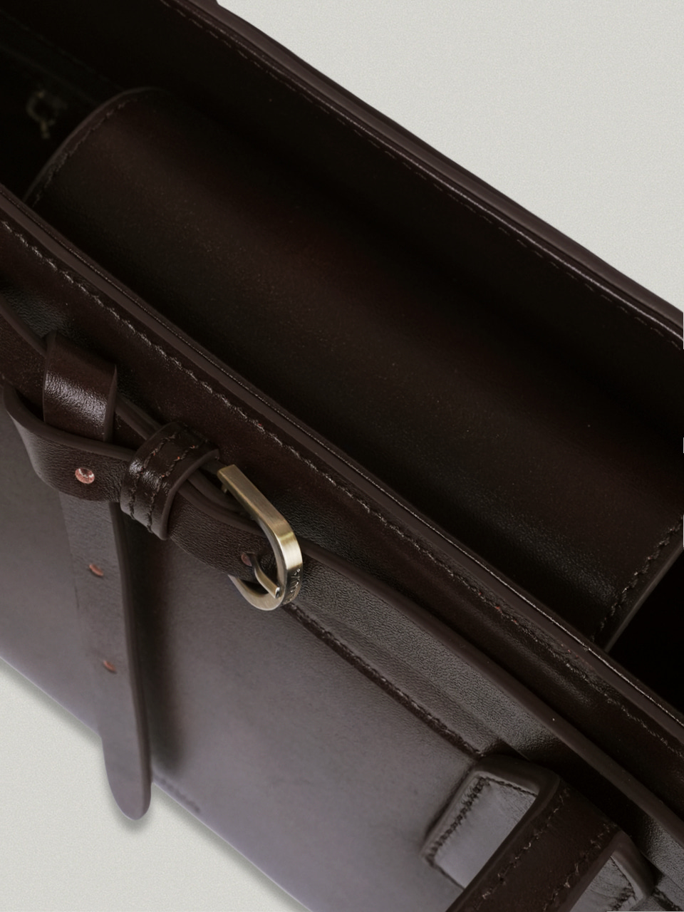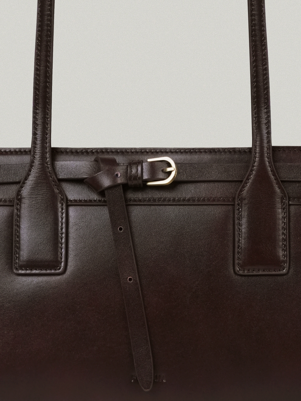 Jour Bag 以獨特的腰帶裝飾為亮點,選用柔軟的天然牛皮製作,充分展現了材質本身的高級質感。流暢的腰帶設計結合包身原有的結構化輪廓,搭配刻有 Folnua 標誌的精緻五金細節,呈現出極高的產品完成度。