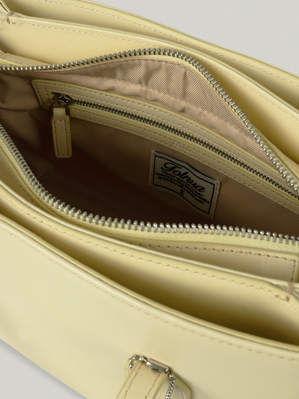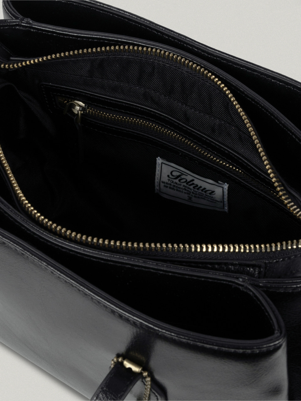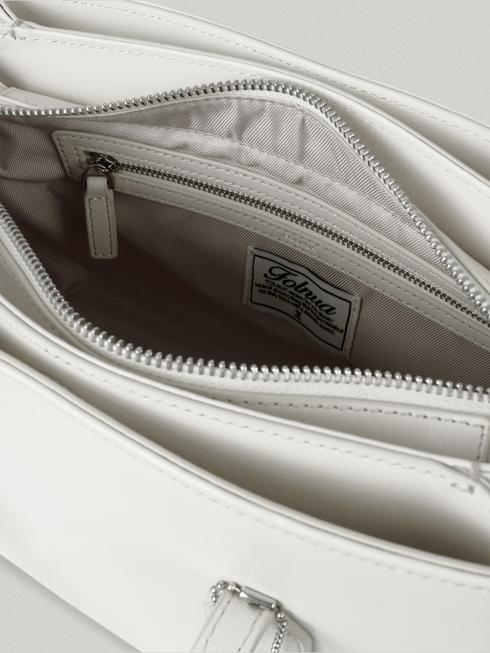 這款包款以倫敦塔橋(Tower Bridge)的形態為靈感設計,整體分為三個獨立收納空間,展現出極具結構感的輪廓與設計細節。拉鍊末端採用刻有 Folnua 經典標誌的壓扣固定,不僅提升了產品的完成度,更彰顯出高貴的質感。