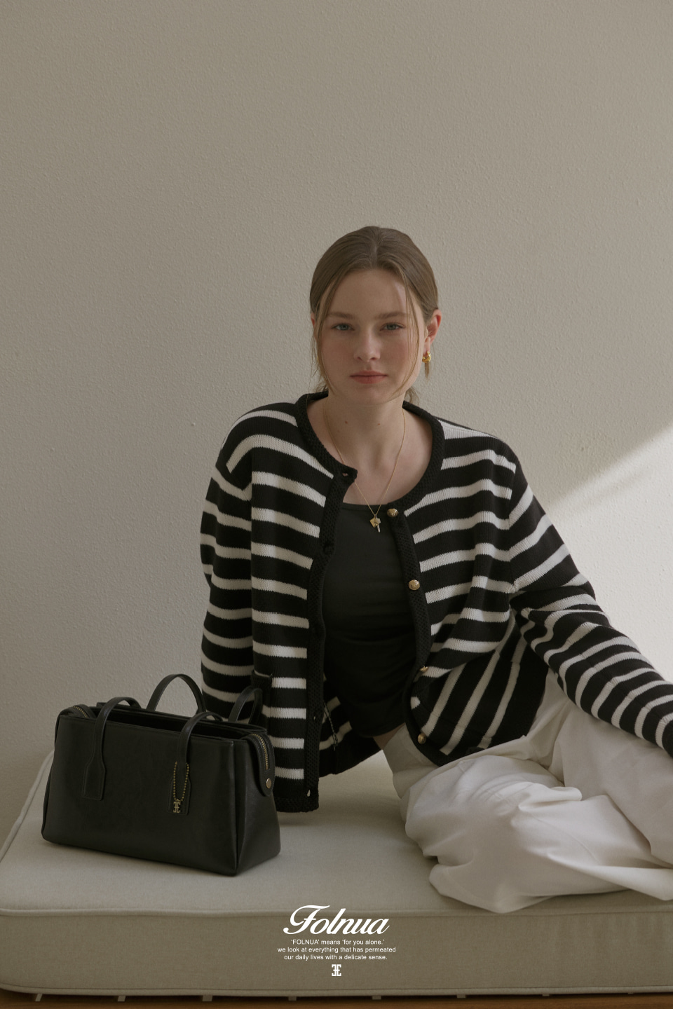 包身附有可拆卸的 Folnua 經典標誌軍牌裝飾,可根據您的日常穿搭隨心點綴,增加造型亮點。